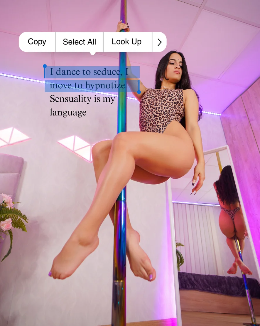 I’m a highly energetic and lively woman, always smiling and radiating positivity. I captivate instantly with my natural charm and effortless charisma. My sensual and sexy appearance turns heads everywhere I go, perfectly matched by my vibrant energy. I absolutely love to dance with passion – every move I make tells a story filled with grace and desire. Singing is another one of my deep loves, and my sweet, charismatic voice reflects the playful, exuberant side of who I am. I’m the perfect mix of joy and sensuality – and in my room, you’ll experience a world where pleasure, passion, and power come together.